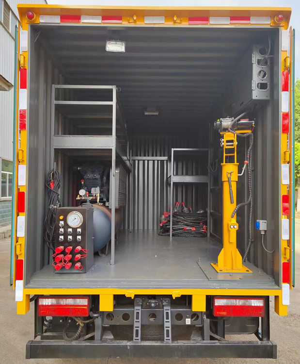 四、其他說明: 東風多利卡雙排座底盤,國六全柴115馬力,5檔變速箱,雙排座駕駛室 側面和后面各一個雙開門,箱內設計兩個貨架,箱內設計照明燈 安裝液壓動力系統(tǒng),三套液壓動力取力快速接口,帶控制面板 兩臺4寸的渣漿泵,帶水帶和液壓管(帶快接) 裝一個液壓驅動空壓機,一個800公斤12V電控小吊機 安裝3500W逆變器,帶電控箱,其他標配